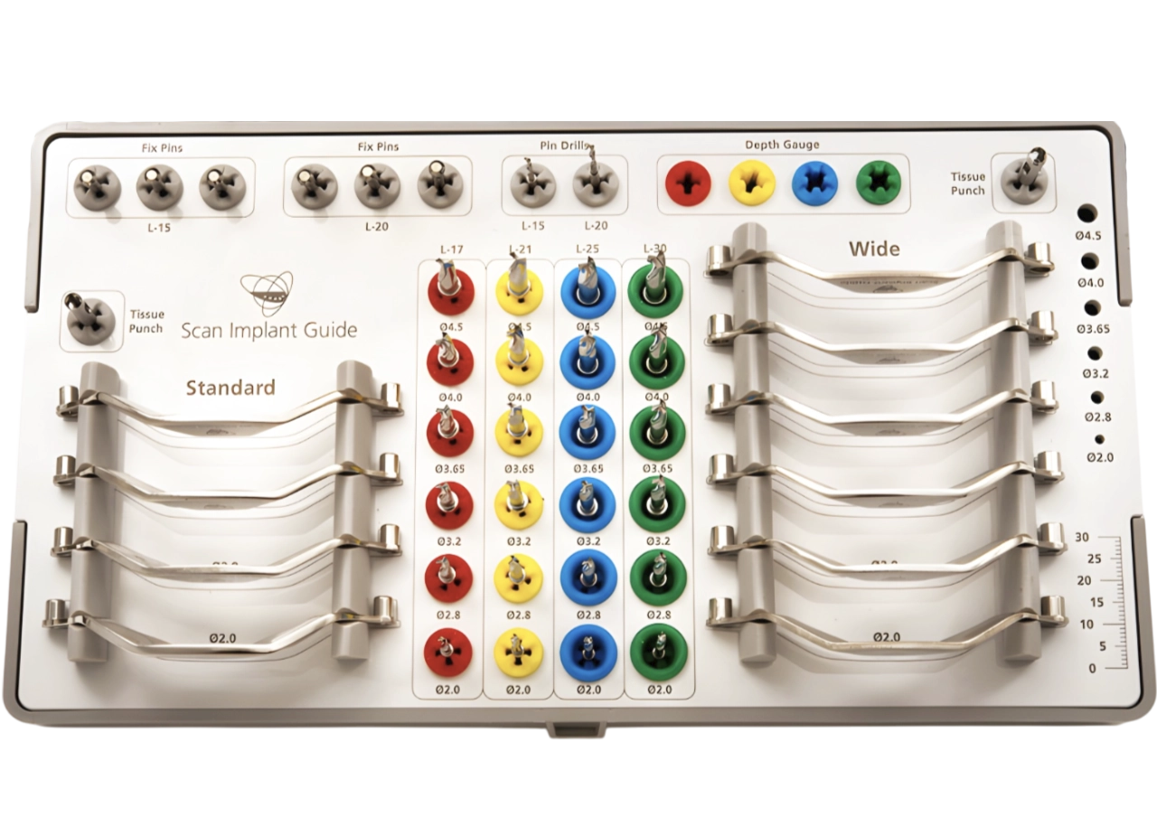 Scan Implant Guide’s surgical kit is designed and organized to make each instrument easily identifiable and placed within the easy reach of the clinician. The precision engineered handled drill guides are provided in a Standard Format for placing implants up to Ø4.2mm, and a Wide Format for placing implants up to Ø5.0mm. The 24 drill bits are in lengths of 17mm, 21mm, 25mm and 30mm, and in diameters from 2.0mm to 4.5mm. This allows the clinician to use guided surgery to place a very broad range of implant sizes. For those cases where flapless surgery is indicated, there is a tissue punch provided for both the Standard and Wide formats. And for cases involving totally (or mostly) edentulous patients, the kit includes fix pins and fix pin drills in two lengths to anchor the surgical guide to the patient’s anatomy.